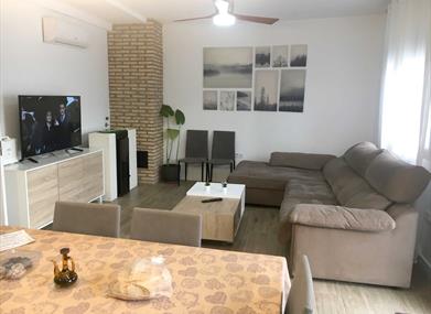 - Salón diáfano de 30 m2 con cocina totalmente equipada. Televisión de 52'', ventilador de techo y sofá Chaise Longue deslizable.