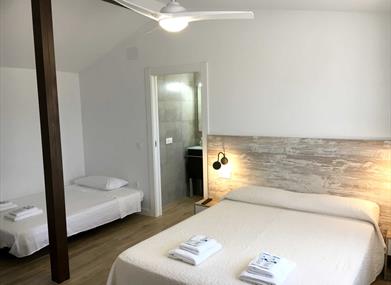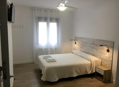 - Cuatro habitaciones con camas de matrimonio de 150 x 200, aire acondicionado con bomba de calor, televisión de 32'' y ventilador de techo.
