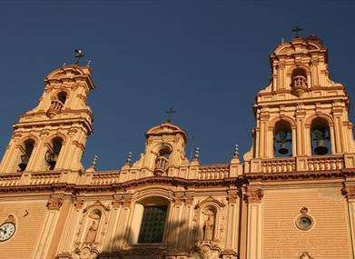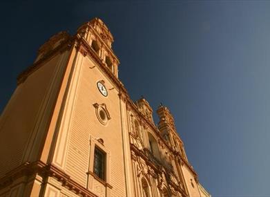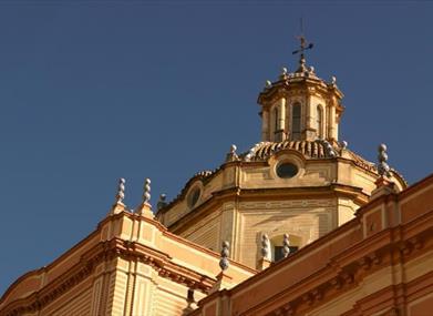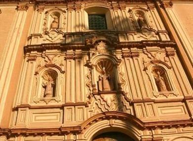 Destaca su fachada, con una original disposición de elementos barrocos, y sus espadañas de influencia colonial. En su interior se abren tres naves y crucero central con retablos laterales, donde figuran obras de artistas tan ilustres como Martínez Montañés o Herrera el Viejo.