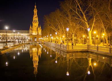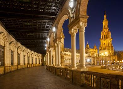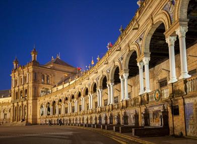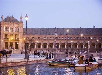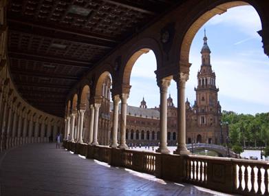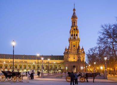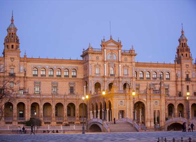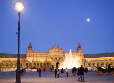 La Plaza de España, encuadrada en el Parque de María Luisa, fue diseñada por el gran arquitecto sevillano Aníbal González como espacio emblemático de la Exposición Iberoamericana de 1929. Su forma semielíptica es un símbolo del abrazo entre la antigua metrópolis y sus colonias. Además, el edificio que la bordea mira hacia el Guadalquivir, lugar desde el que se emprende el viaje a América.