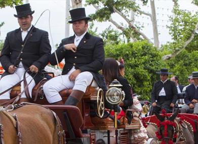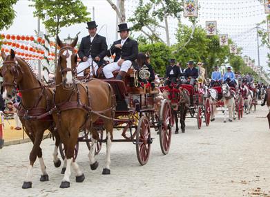 La música suena de fondo, estalla el color, los lunares de los vestidos engalanan el ambiente, los jinetes exhiben sus caballos paseando entre la multitud.